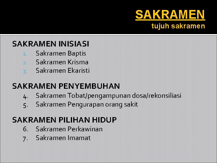 7 sakramen dalam gereja katolik sakramen berasal dari kata 'mysterion' (yunani), yang dijabarkan dengan kata 'mysterium' dan 'sacramentum' (latin).